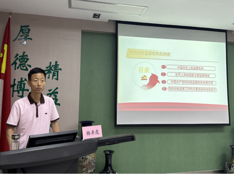 随后,杨卓虎以“党的纪检监察机构及制度”为题讲授党纪学习教育专题党课。党课运用大量的史实、理论成果回顾了中国共产党纪检监察机构的发展历程、党的纪检监察工作的主要成就和经验启示。他勉励全体师生党员要自觉将党规党纪作为一门必修课,提高思想认识,不断提升自身素质,加强党性锤炼,主动担当作为,赋能学校高质量发展。